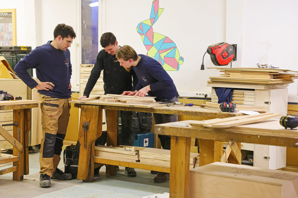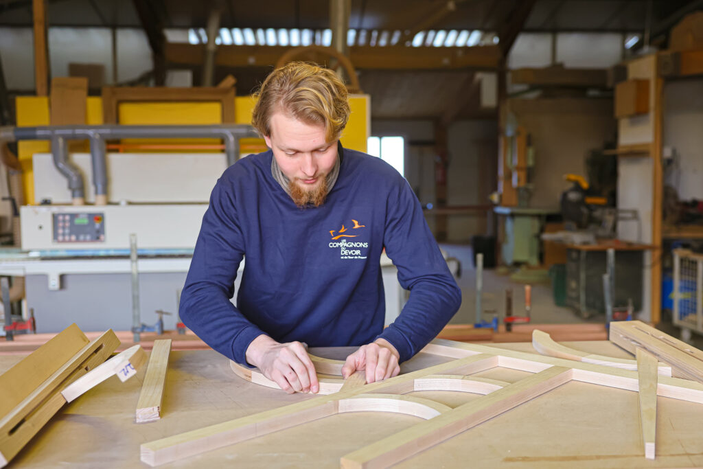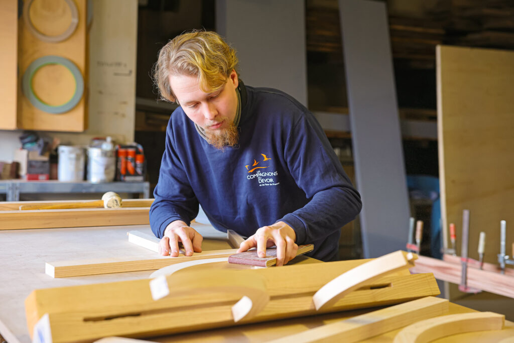 Lucien Colin, 23 ans, a découvert les Compagnons du devoir lors d’une journée portes ouvertes en fin de 3e. Un enseignement liant formation en entreprises et cours généraux, qui a convaincu le jeune homme et ses parents. Quant au choix de la filière menuiserie, il s’est fait tout naturellement : « Le bois m’a toujours attiré » explique-t-il.