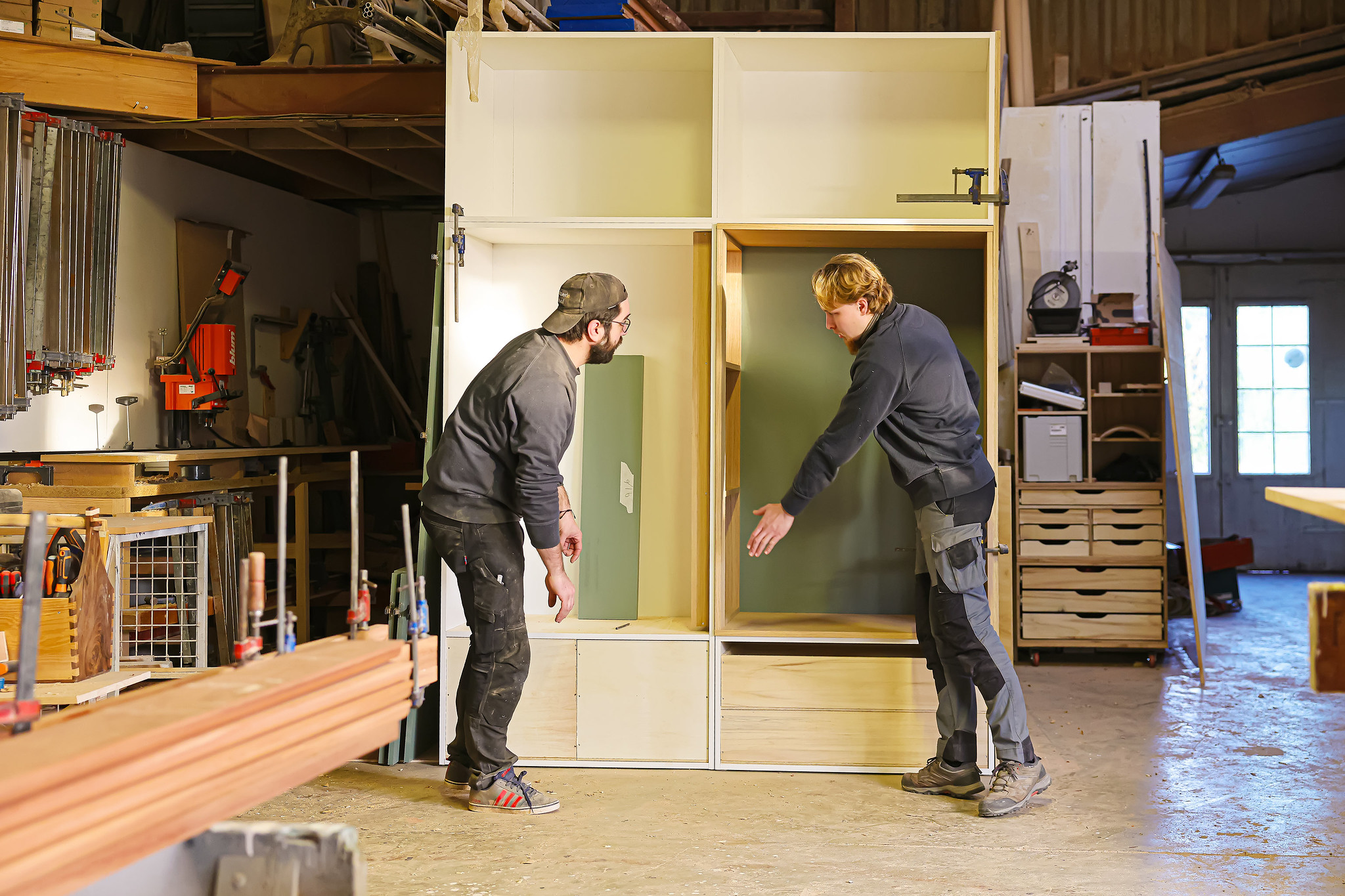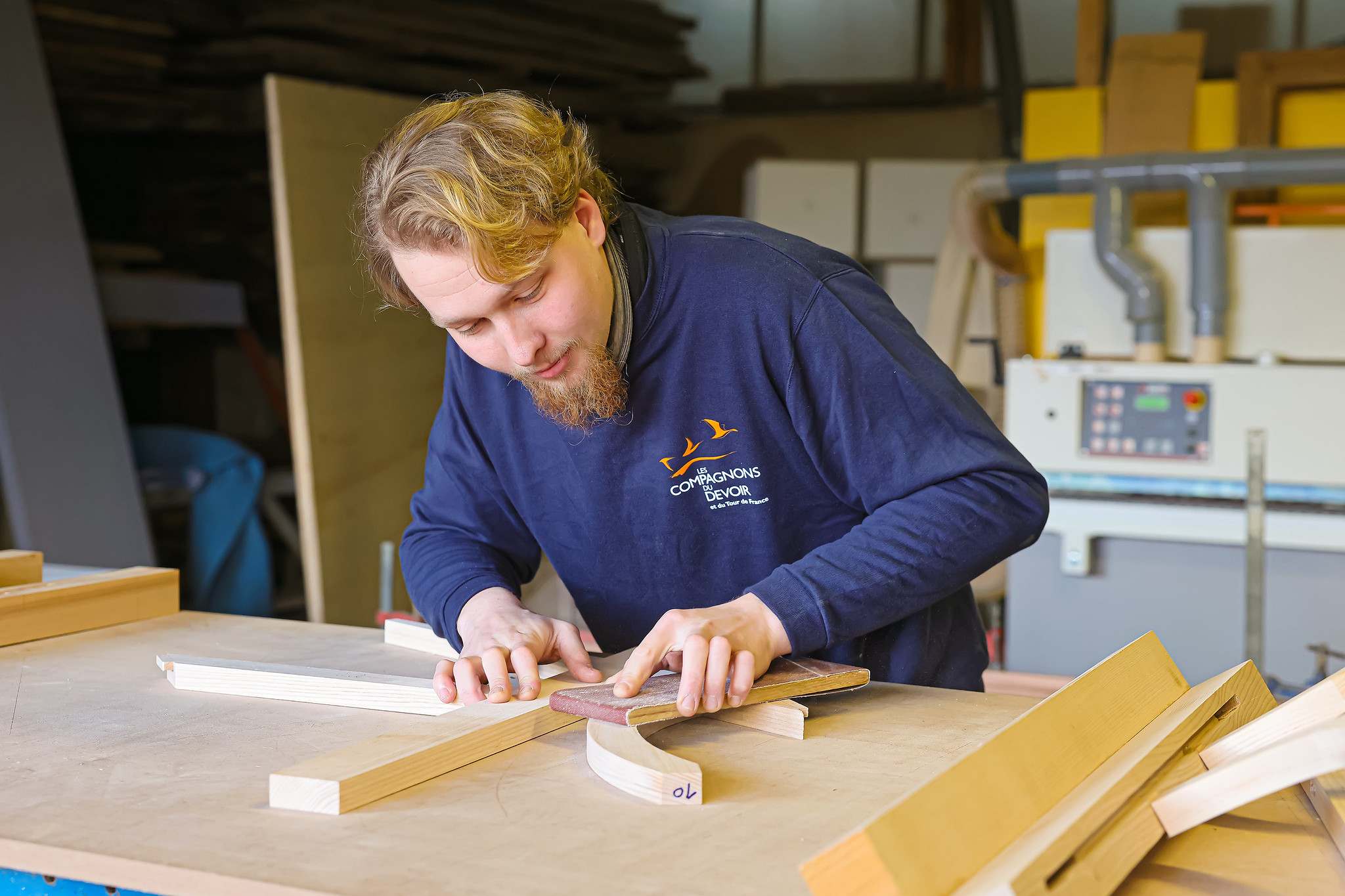 Lucien Colin, 23 ans, a découvert les Compagnons du devoir lors d’une journée portes ouvertes en fin de 3e. Un enseignement liant formation en entreprises et cours généraux, qui a convaincu le jeune homme et ses parents. Quant au choix de la filière menuiserie, il s’est fait tout naturellement : « Le bois m’a toujours attiré » explique-t-il.