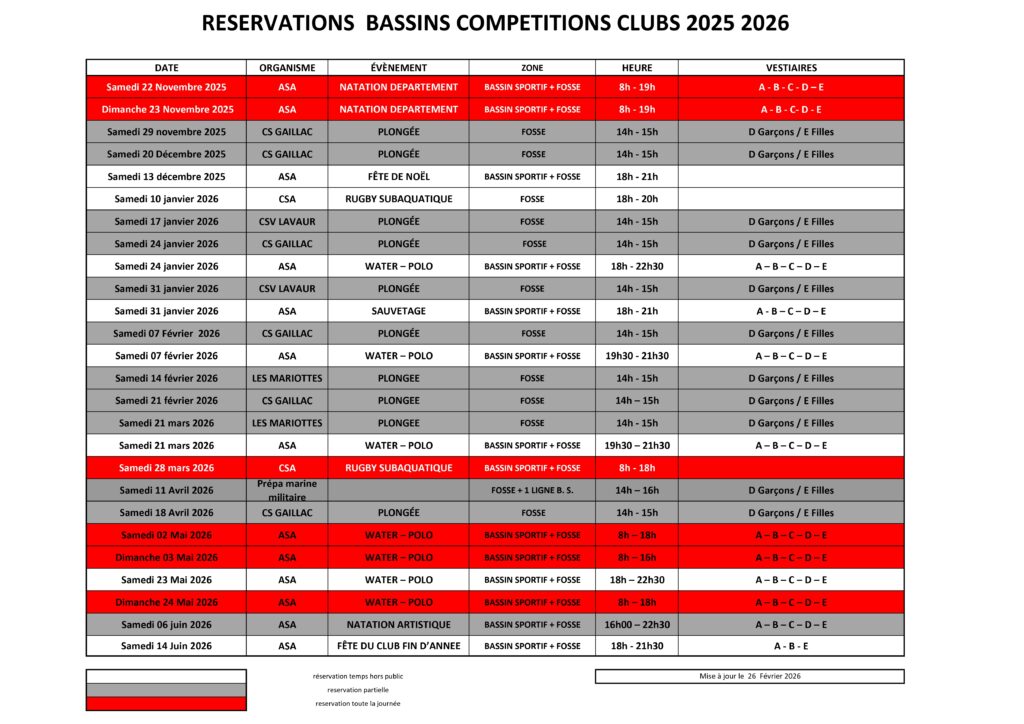 Réservations bassins compétitions – 2025-2026