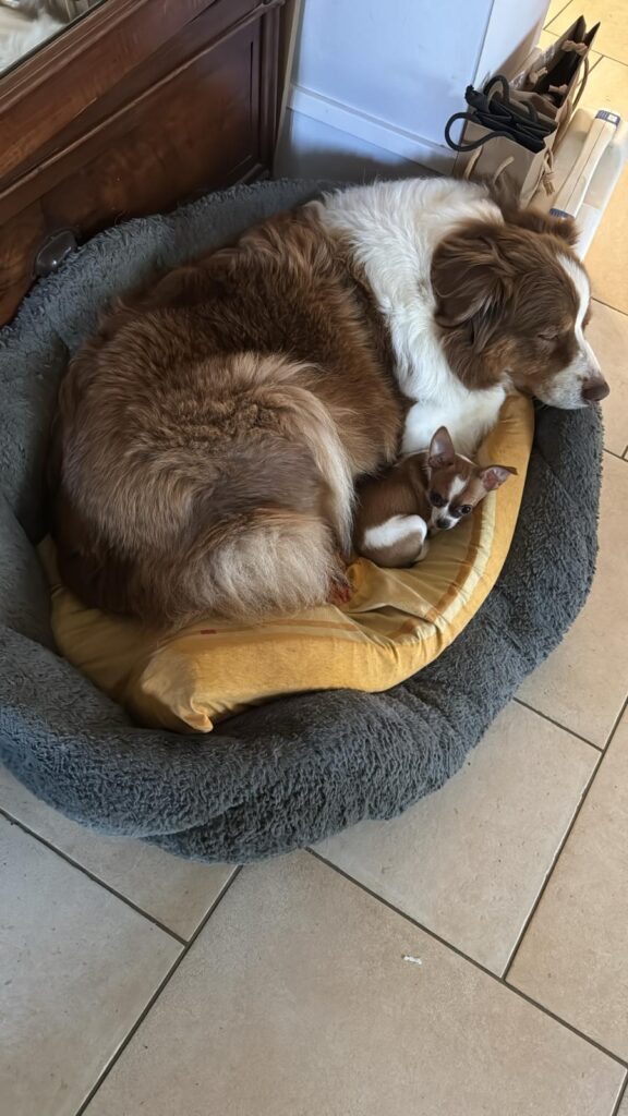 » Fifi se porte comme un charme,  elle partage notre vie pour notre plus grand bonheur.  Elle s’entend très bien avec Praline notre bergère australienne (elle dorment parfois ensemble et lui monte sur le dos pour dormir ou juste pour passer un moment ou me regarder faire la cuisine)